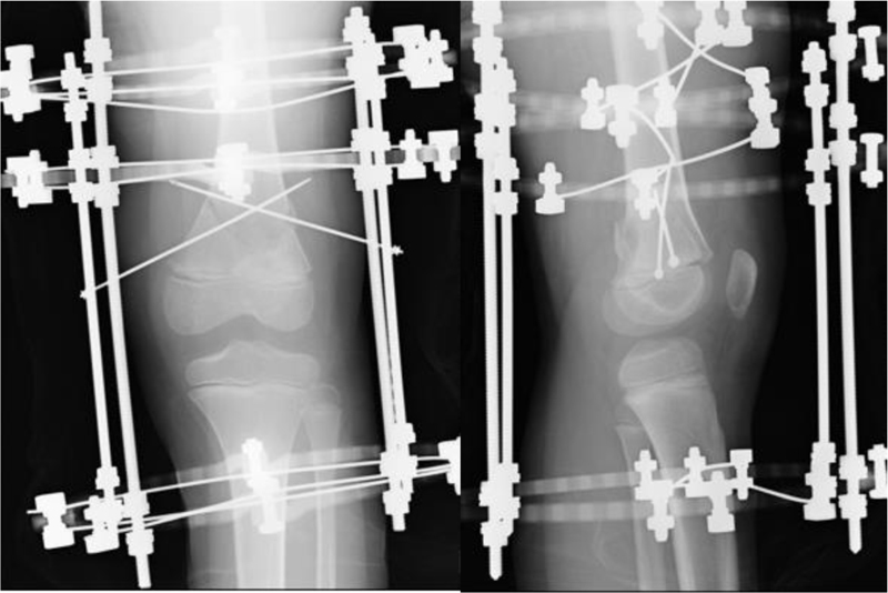 We used circular external fixation, which enables rigid immobilization and walking with full weight bearing without pins injuring the physis.