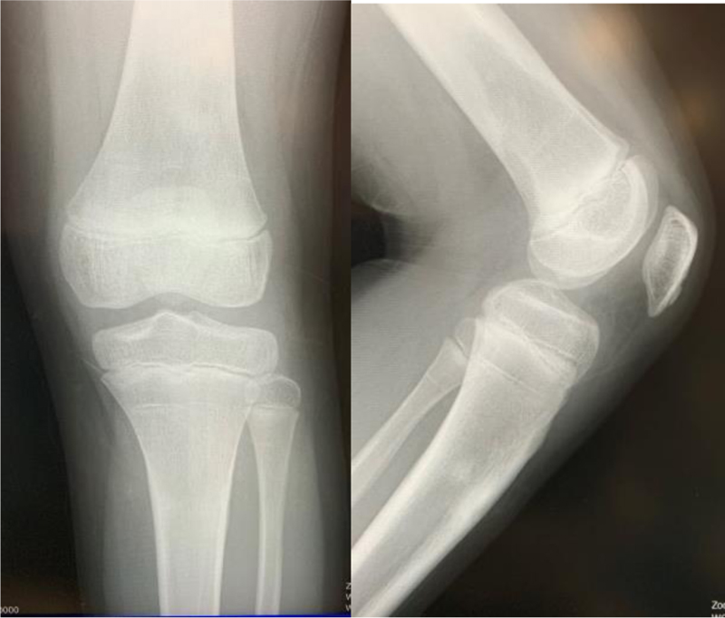 A 9-year-old boy was injured in a skiing accident, and his injury was a Salter-Harris type II fracture of the distal femoral epiphysis. We immediately performed percutaneous pin fixation with circular external fixation under general anesthesia. After surgery, he was allowed to walk with full weight bearing. One year after surgery, he had no pain, and his knee regained full extension and 140°flexion.