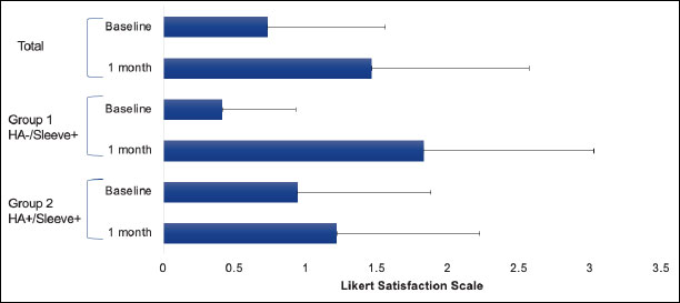 At one month, both groups demonstrated improvement in knee health, pain, and satisfaction. KOOS JR scores improved by 12.27 points in the HA-/Sleeve+ group and 9.809 points in the HA+/Sleeve+ group. Pain scores decreased by 3 points and 2 points, respectively. Satisfaction scores increased by 1.416 points in the HA-/Sleeve+ group and 0.278 points in the HA+/Sleeve+ group. Improvements were greater in the HA-/Sleeve+ group across all measures.