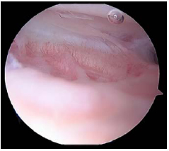 All the patients were placed in the supine position on an operating table. A tourniquet was applied to the thigh with the knee in the maximum possible flexion position to minimize capture of the quadriceps femoris muscle. The procedure was performed using the three-portal technique with two standard anterolateral and anteromedial portals in addition to the accessory superolateral portal [8, 9]. Tissue adhesions were identified (Fig. 1) and debrided using a radiofrequency device (Arthrocare, Arthrocare Sports Medicine, USA) (Fig. 2). Subsequently, gentle manipulation was performed by applying slight pressure on the tibial tubercle to avoid fractures or disruption of the extensor mechanism. After the operation, continuous passive motion was immediately initiated.