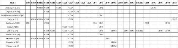 | Zvaifler et al. [49] | Mesenchymal precursor cells found in the blood | A minority of adult marrow cells express CD34 BMPCs stained strongly with anti-CD44 antibody. Conventional T-cell (CD3), monocyte (CD14, CD68), and B-cell (CD20) antibodies stained neither of the two BMPC populations, nor did they react to anti-LCA (CD45), anti-VCAM (CD106), or MHC-Class II (anti-DR) ADDIN REFMGR.CITE ADDIN EN.CITE.DATA [49] |